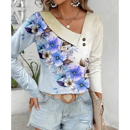 Women’s Shirt Blouse Graphic Casual Black Print Long Sleeve Fashion V Neck Regular Fit Spring & Fall