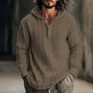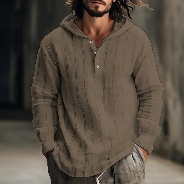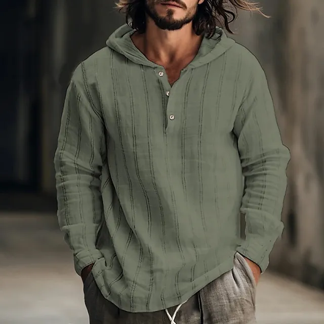 Men’s Linen Shirt Hooded Shirt Maroon White Army Green Long Sleeve Stripes Hooded Spring & Fall Holiday Vacation Clothing Apparel