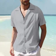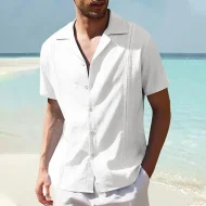 Men’s Shirt Guayabera Shirt Linen Shirt Summer Shirt Beach Shirt Black White Navy Blue Short Sleeve Plain Camp Collar Summer Casual Daily Clothing Apparel