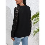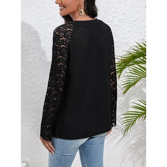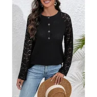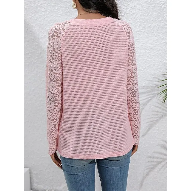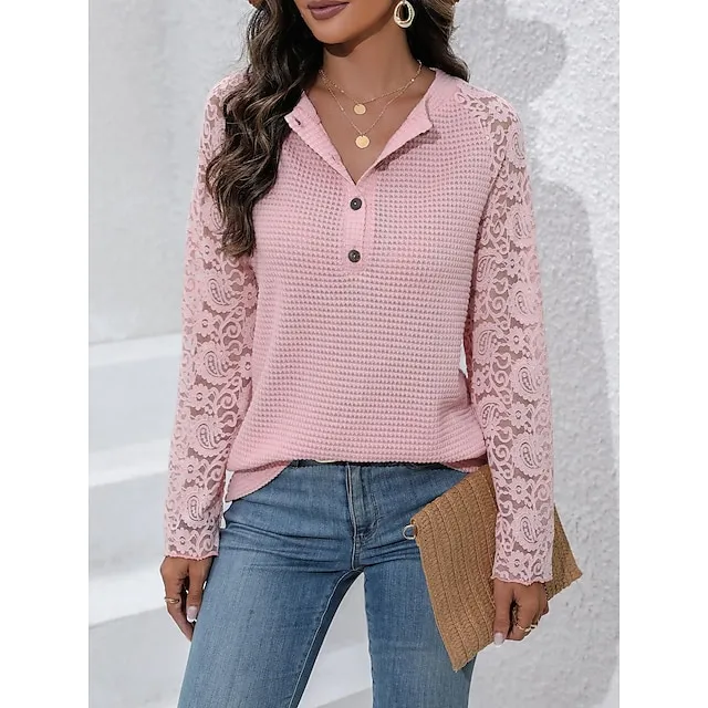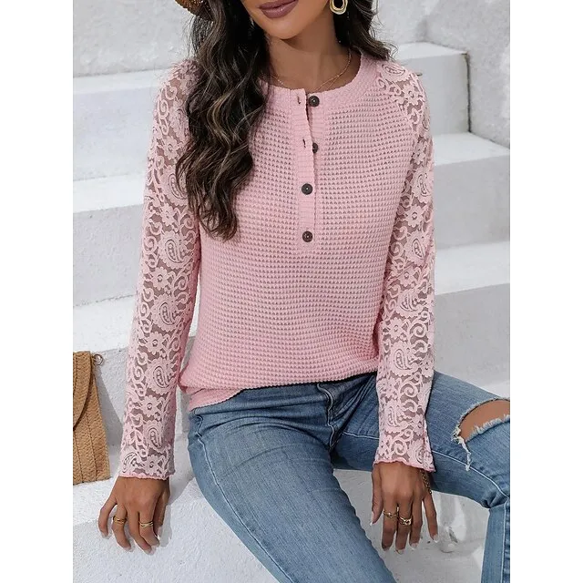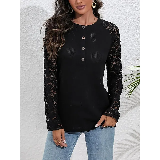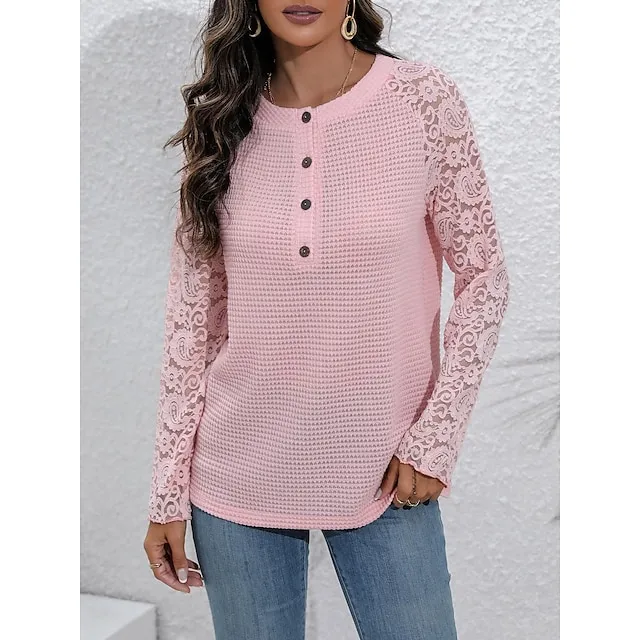 Shirt Blouse Women’s Black Pink Beige Solid Color Lace Button Street Daily Fashion Round Neck S