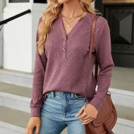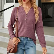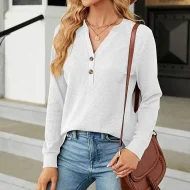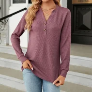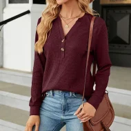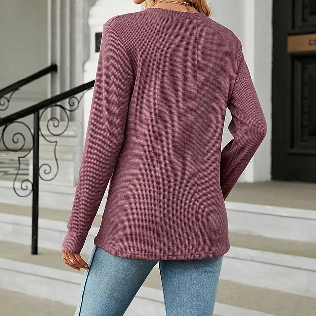 Shirt Blouse Women’s Black White Wine Solid / Plain Color Button Daily Fashion V Neck Waffle Fabric Regular Fit S