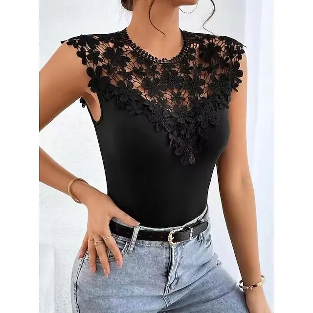 Tank Women’s Black Plain Lace Street Daily Fashion Round Neck Regular Fit S