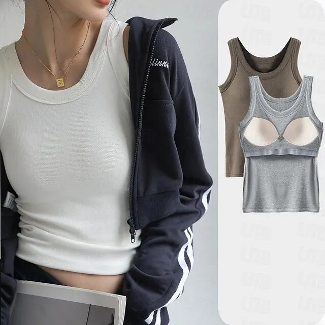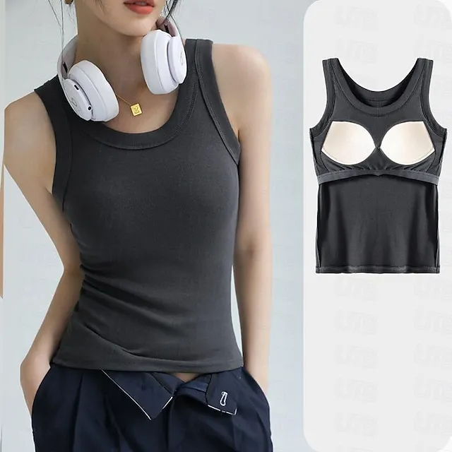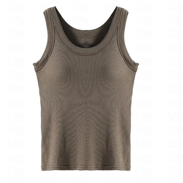 Tank Women’s Black White Khaki Solid Color Removable Pad Street Daily Fashion Round Neck M