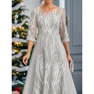 Women’s Christmas Party Dress Lace Dress Cocktail Dress Midi Dress Silver 3/4 Length Sleeve Pure Color Lace Spring Fall Winter Crew Neck Fashion Winter Dress Office Christmas XXL 3XL