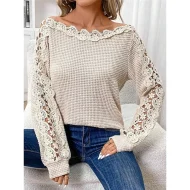 Women’s Lace Shirt Shirt Blouse Eyelet top Waffle Plain Casual Khaki Lace Long Sleeve Fashion Modern Off Shoulder Regular Fit Summer Spring
