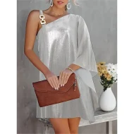 Women’s Party Dress Cocktail Dress Wedding Guest Dress Mini Dress Silver Long Sleeve Pure Color Patchwork Spring Fall Winter One Shoulder Fashion Winter Dress Office Vacation S M L XL XXL 3XL