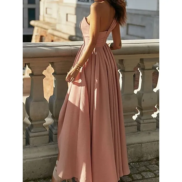 Women’s Party Dress Homecoming Dress Wedding Guest Dress Long Dress Maxi Dress Pink Sleeveless Pure Color Pleated Summer Spring One Shoulder Party Birthday Wedding Guest Vacation Slim S M L XL
