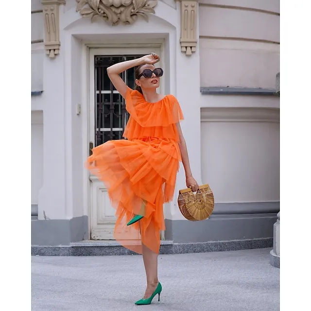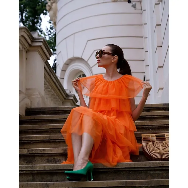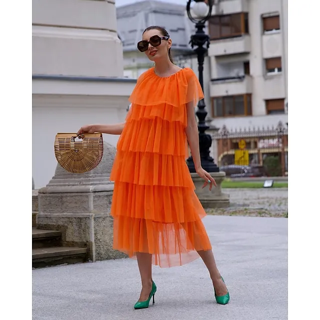 Women‘s Party Dress Wedding Guest Cocktail Dress Semi Formal Dress Midi Dress Orange Short Sleeve Pure Color Mesh Summer Spring Crew Neck Party Summer Dress Loose Fit S M L XL 2XL 3XL