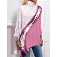 Women’s Shirt Blouse Color Block Casual Holiday Pink Blue Orange Print Asymmetric Hem Long Sleeve Fashion High Neck Regular Fit Spring & Fall