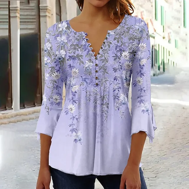Women’s Shirt Blouse Floral Holiday Yellow Blue Purple Button Print 3/4 Length Sleeve Basic Round Neck Regular Fit
