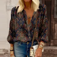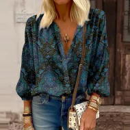 Women’s Shirt Blouse Green Graphic Button Print Long Sleeve Casual Fashion Standing Collar Regular Fit Spring & Fall
