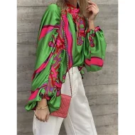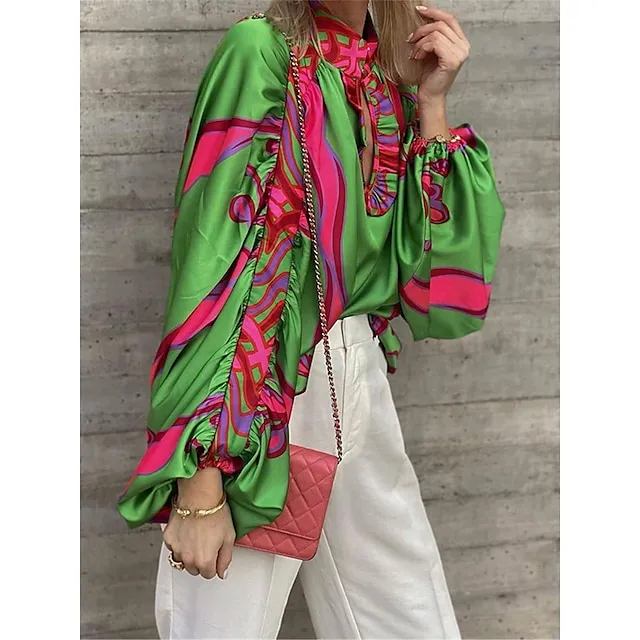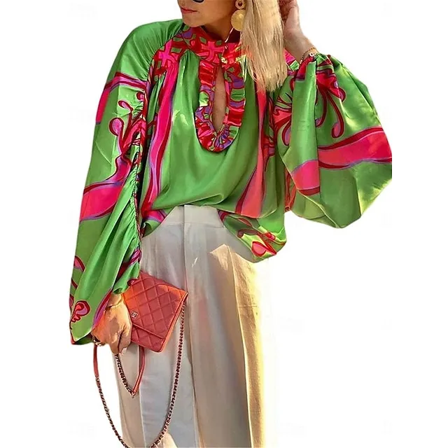 Women’s Shirt Blouse Peasant Blouse Graphic Casual Holiday Green Print Long Sleeve Boho Standing Collar Regular Fit Summer Spring