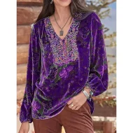 Women’s Shirt Blouse Velvet Floral Party Christmas New Year Yellow Red Purple Print Long Sleeve Basic V Neck Regular Fit Spring Fall