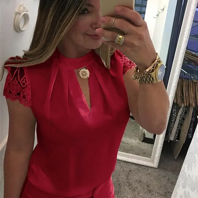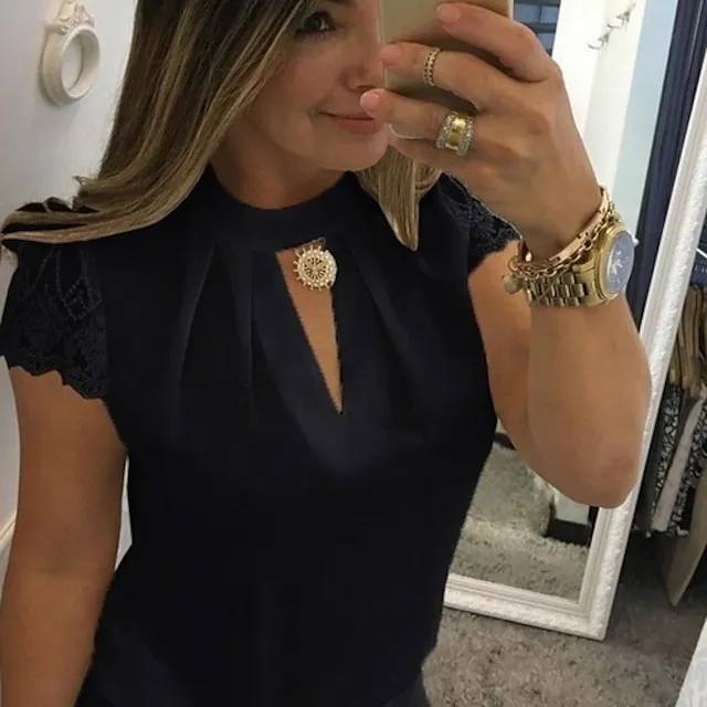 Women’s Shirt Going Out Tops Blouse Eyelet top Black White Red Plain Solid Colored Lace Patchwork Short Sleeve Casual Daily Basic Casual Round Neck S