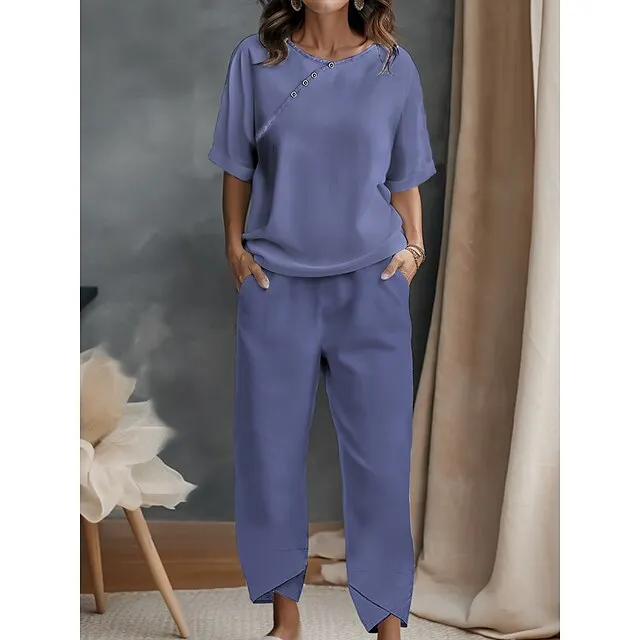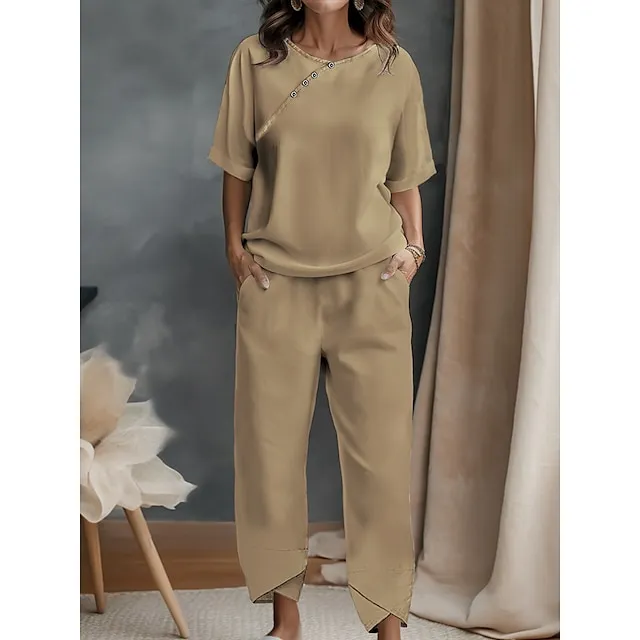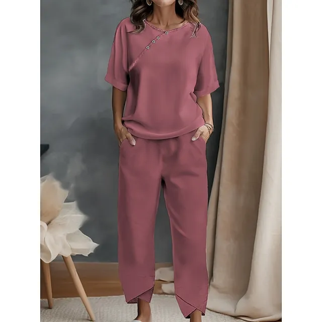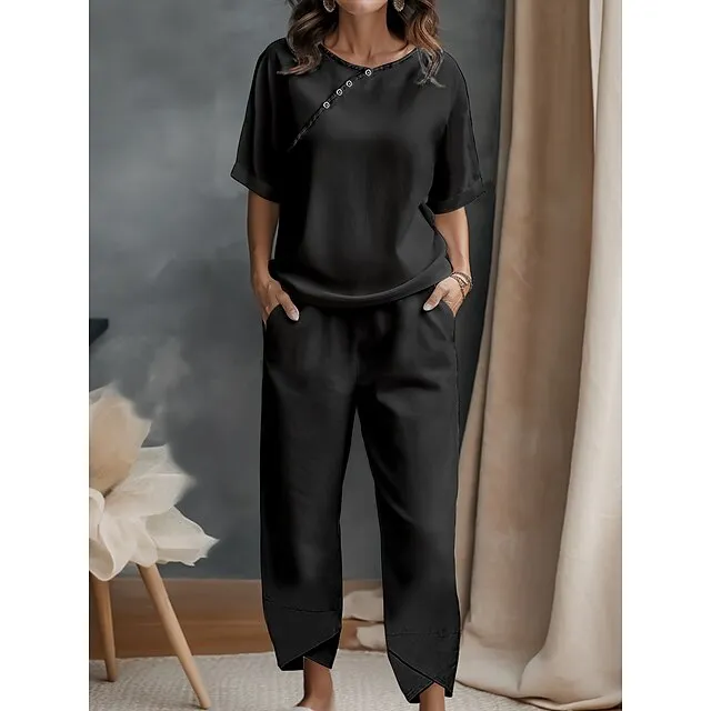 Women’s Shirt Pants Sets Solid Color Black White Red Print Casual Daily Daily Basic Round Neck Regular Fit Fall & Winter