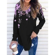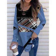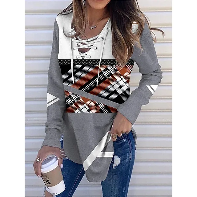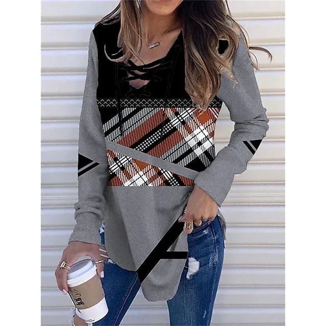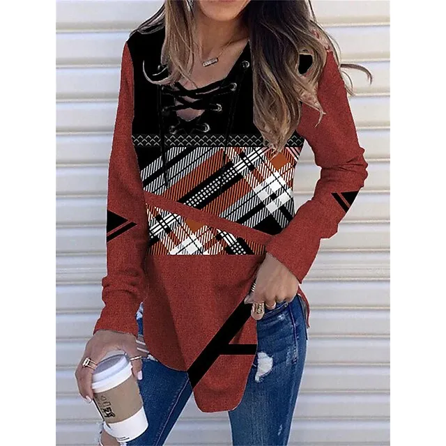 Women’s T shirt Tee Floral Plaid Casual Black Red Blue Print Long Sleeve Fashion V Neck Regular Fit Spring & Fall