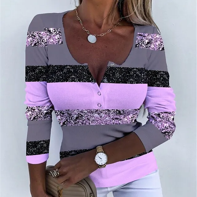 Women’s T shirt Tee Henley Shirt Color Block Daily Weekend Yellow Pink Blue Print Button Long Sleeve Fashion U Neck Regular Fit Spring & Fall