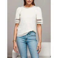 Women’s White Lace Tops Plain Eyelet Hollow Casual Round Neck T-Shirts Fashion Puff Sleeve Modern Regular Fit Summer